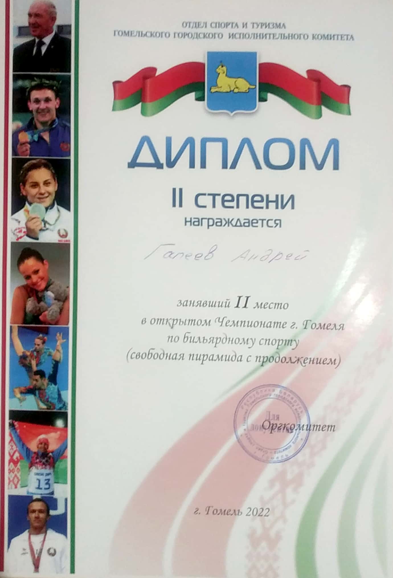 10-11 декабря 2022 г. в г. Гомеле прошел открытый Чемпионат г. Гомеля по бильярду в дисциплине «Свободная пирамида с продолжением» в БК «Дуплет». В соревнованиях приняли участие 22 спортсмена, из них 2 мастера спорта и 6 кандидатов в мастера спорта, в том числе и работник филиала «Гомельские тепловые сети» РУП «Гомельэнерго» Гапеев Андрей Леонидович, заместитель начальника района по котельному оборудованию ЗРТС, который в упорнейшей борьбе занял почетное 2 место.