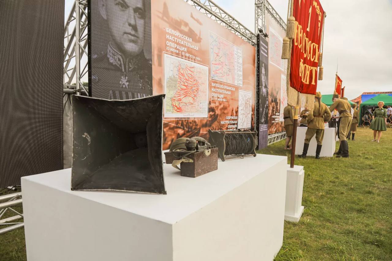 Стенд с большим экраном приковывает внимание многочисленных зрителей. Здесь демонстрируется специально подготовленный фильм с современной графикой о ходе операции «Багратион» и хроника освобождения Беларуси. Рядом располагается выставочный стенд с военными атрибутами: фляжками, подсумками для снаряжения, медицинскими сумками, которые особенно заинтересовали присутствующих на празднике детей. На профсоюзной площадке отражена и деятельность трех Белорусских и Первого Прибалтийского фронтов, которые при взаимодействии с белорусскими партизанами и подпольщиками блестяще осуществили стратегическую наступательную операцию «Багратион».