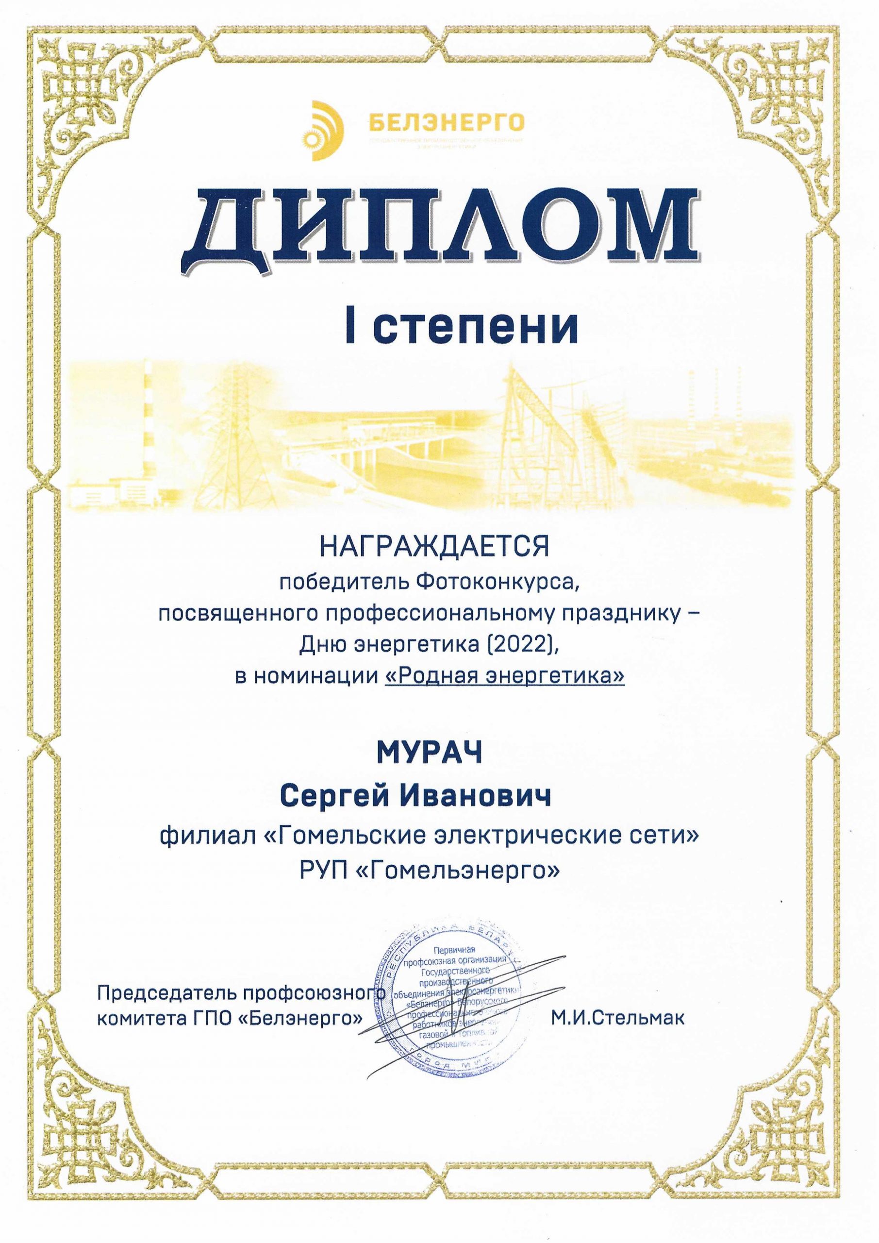 Победителем фотоконкурса, посвященного профессиональному празднику – Дню энергетика (2022), в номинации «Родная энергетика» (работа «Солнечное гало») стал начальник отдела автоматизированных систем управления филиала «Гомельские электрические сети» РУП «Гомельэнерго» Сергей Мурач.