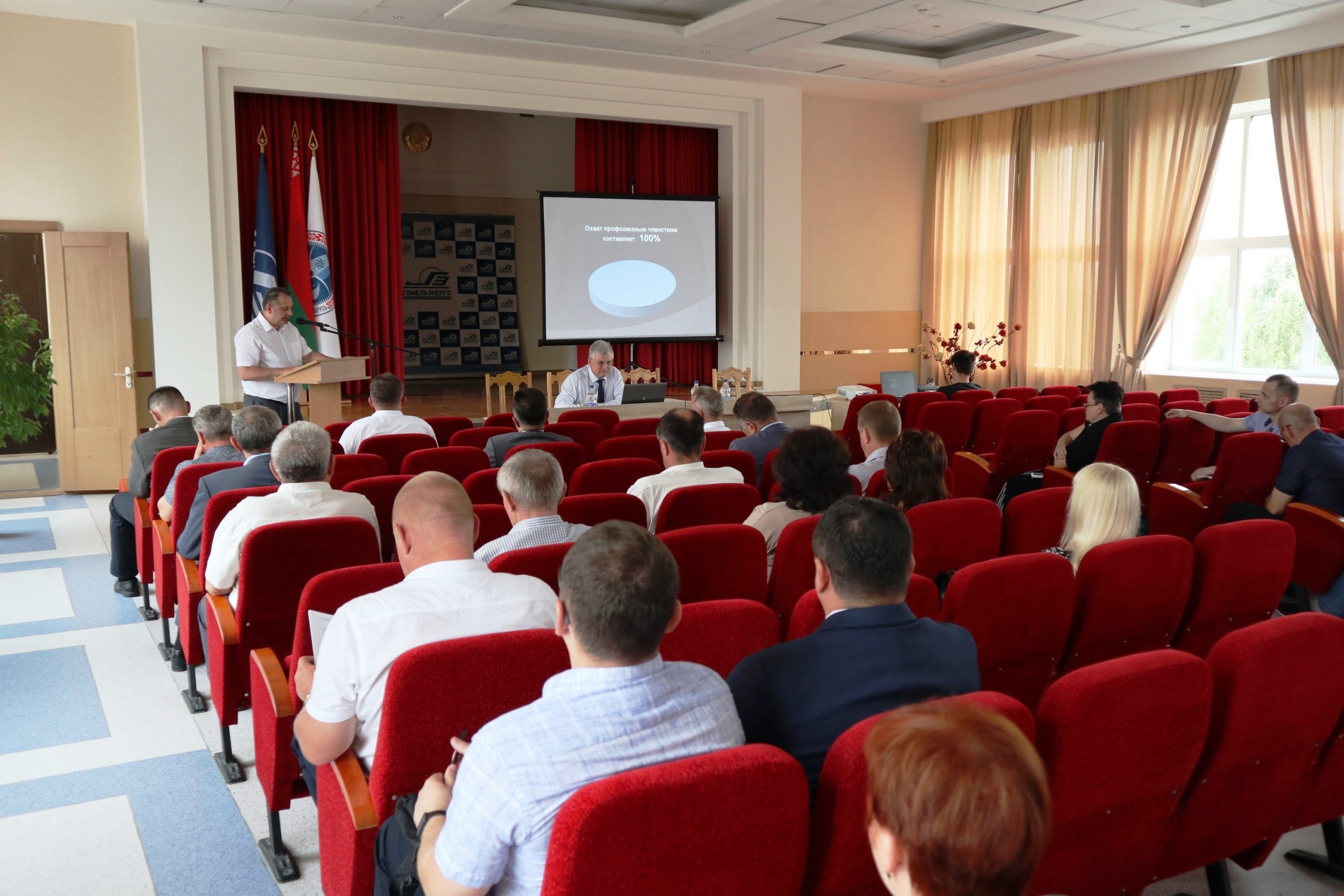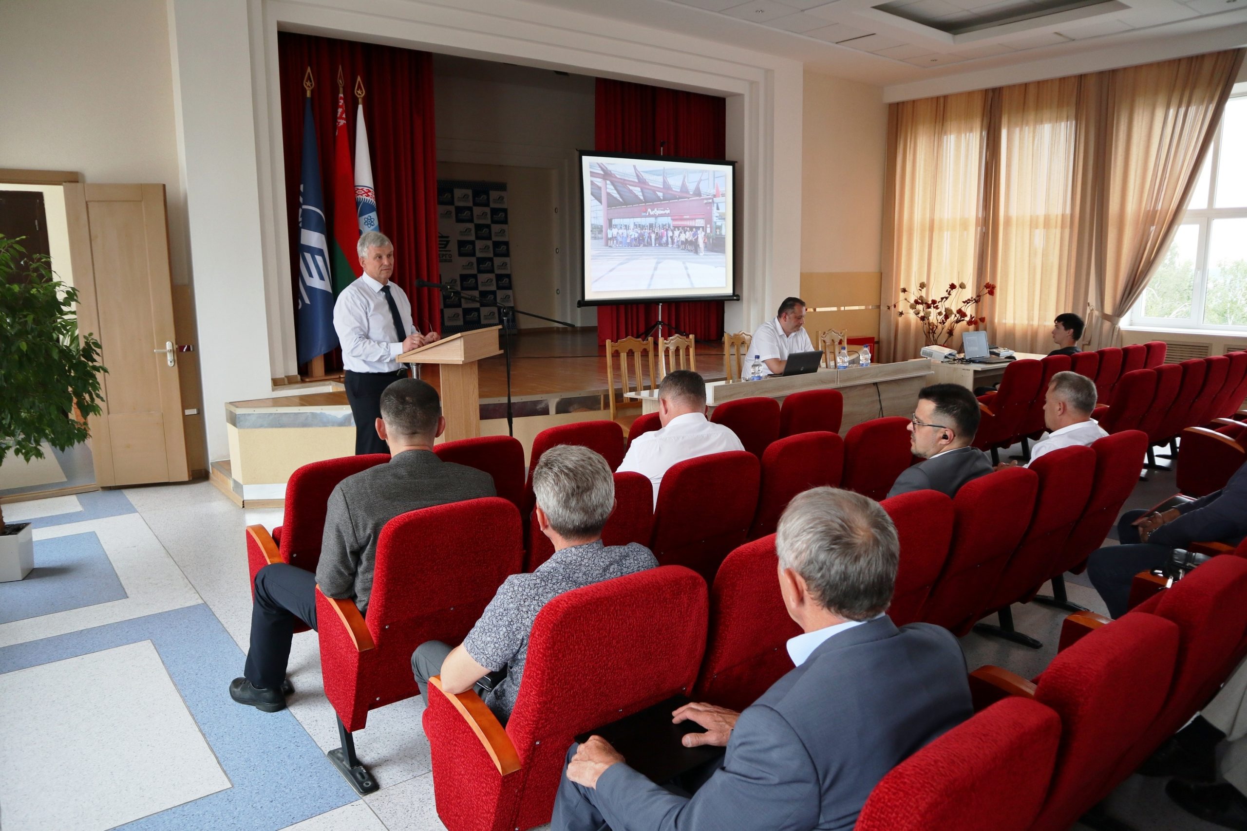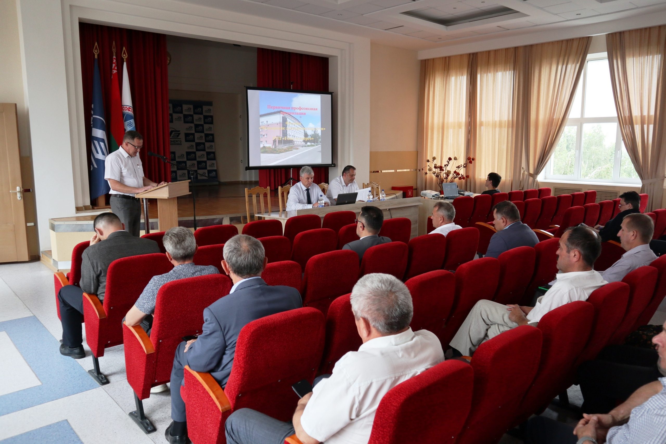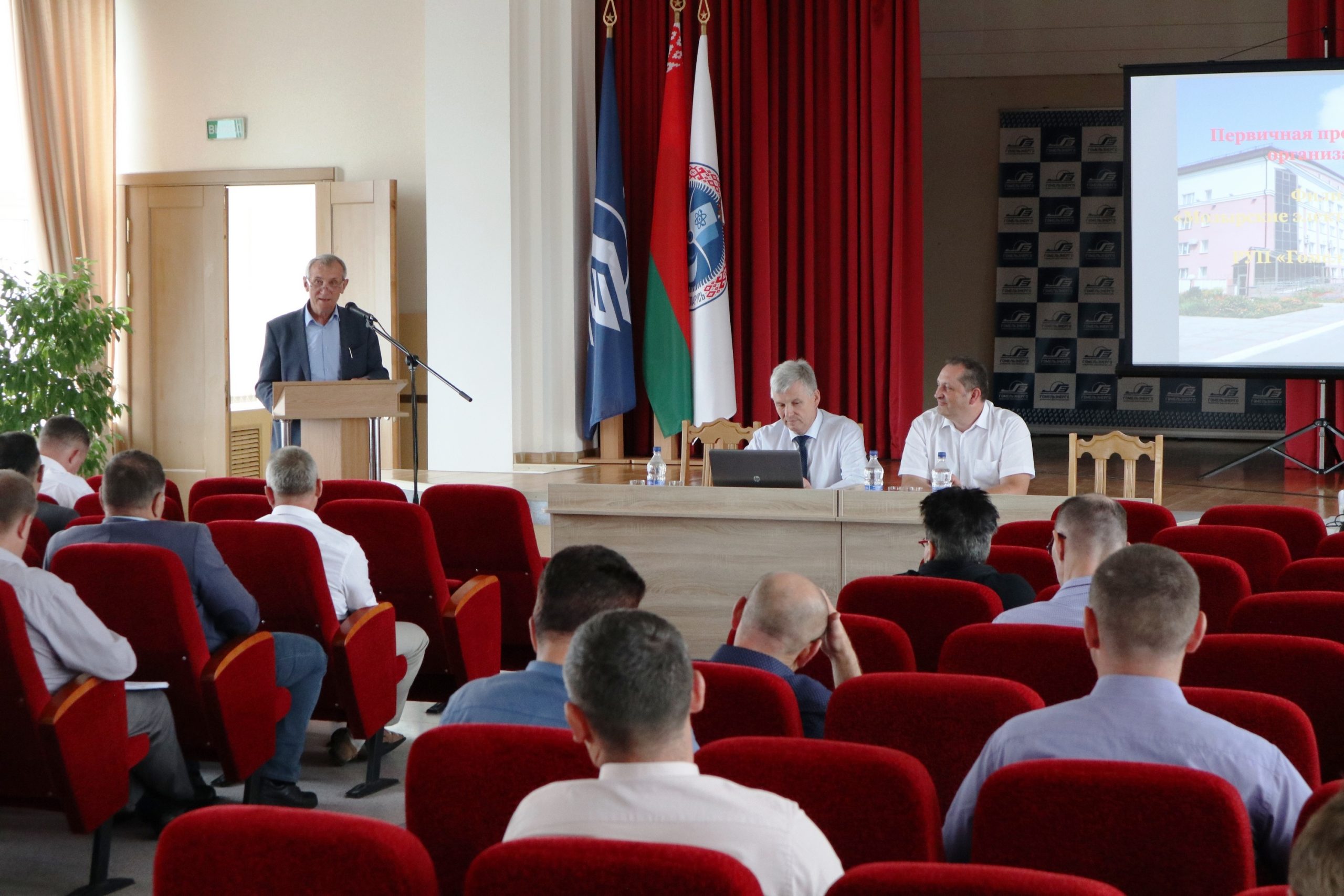 С докладами выступили: главный инженер филиала Владимир Усенко, заместитель директора по капитальному строительству Владимир Малиновский, заместитель директора по общим вопросам и идеологической работе Андрей Городницкий, председатель профсоюзного комитета Александр Барановский.