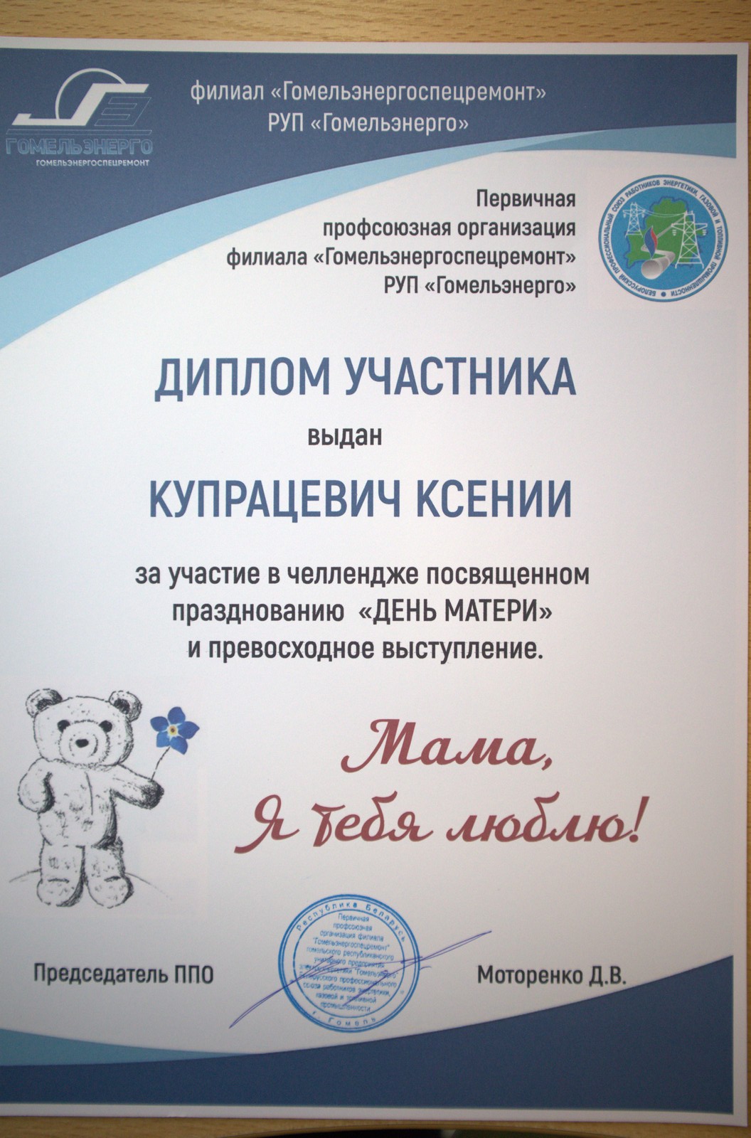 В филиале «Гомельэнергоспецремонт» прошли праздничные мероприятия посвященные празднованию «Дня Матери». В преддверии праздника дети сотрудников филиала приняли участие в Челлендже, в рамках которого детей просили ответить на 6 вопросов о своей маме. Маленькие участники получили памятные дипломы и подарки.